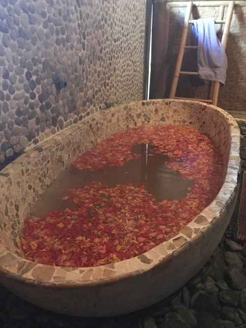 Mary is fluent in Bahasa Indonesian so I’ve been relying on her to do a lot of the talking. I have a bad habit of responding in German (the only other language I know) whenever someone speaks to me in anything other than English. I’m also overly cautious about insulting someone because I can’t understand them. I smiled and nodded at the masseuse even though I still didn’t know what I was supposed to do. She left and I stripped down to my bra and knickers. I was just about to go full monty and jump in the stone tub when Mary walked in. I asked her about the shower. She looked at me like I was nuts, which I am because I am a person incapable of relaxing.